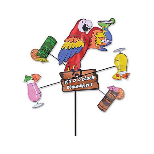 It's 5 O'Clock Somewhere! The unique, festive, Island Parrot whirligig spinner spins with only a breeze! All parts enclosed, including 7" ground stake that holds spinner upright and holds well in dirt, sand, gravel and grass. No tools required to assemble.
