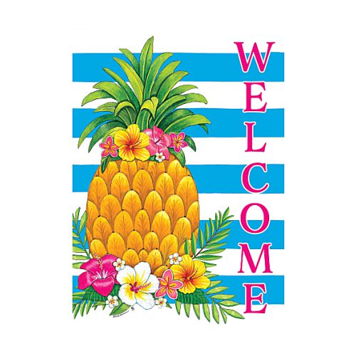 Introducing our Pineapple Stripe Decorative Flag – the perfect blend of charm and hospitality for your home! This double-sided flag features a welcoming "Welcome" message readable from any angle. Printed using a durable dye-sublimation process in the USA, its vibrant colors withstand the elements. Add a touch of warmth to your outdoor space with this enduring symbol of hospitality.