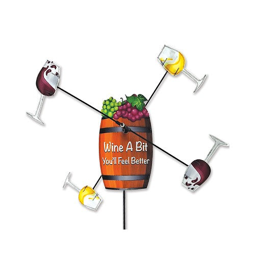 Our WINE A BIT, you'll feel better WhirliGig Spinner is a unique, festive, and durable 21" spinner that will spin with only a gentle breeze. With all the necessary components included and no tools required to assemble, it is the perfect addition to your outdoor space. Its SunTex fabric wings work efficiently even in lower breezes, making it more reliable than metal or wooden alternatives. The included 7" ground stake holds the spinner upright and ensures it stays firmly in soil, sand, gravel, and grass.