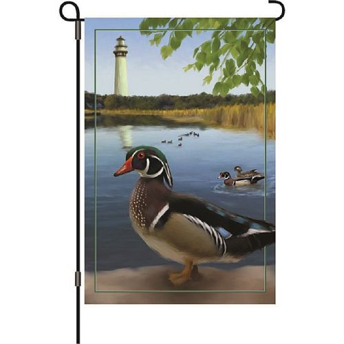 This beautiful image showcases a focused look at a duck surrounded by other ducks and a lighthouse in the distant background. Made from long-lasting and fade-resistant polyester fabric, these vibrant and detailed flags are created through a sublimation process, resulting in vivid and captivating colors and designs.